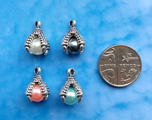 Silver alloy dragon claw pendant holding bead. Choice of white, black, light pink or light blue bead.